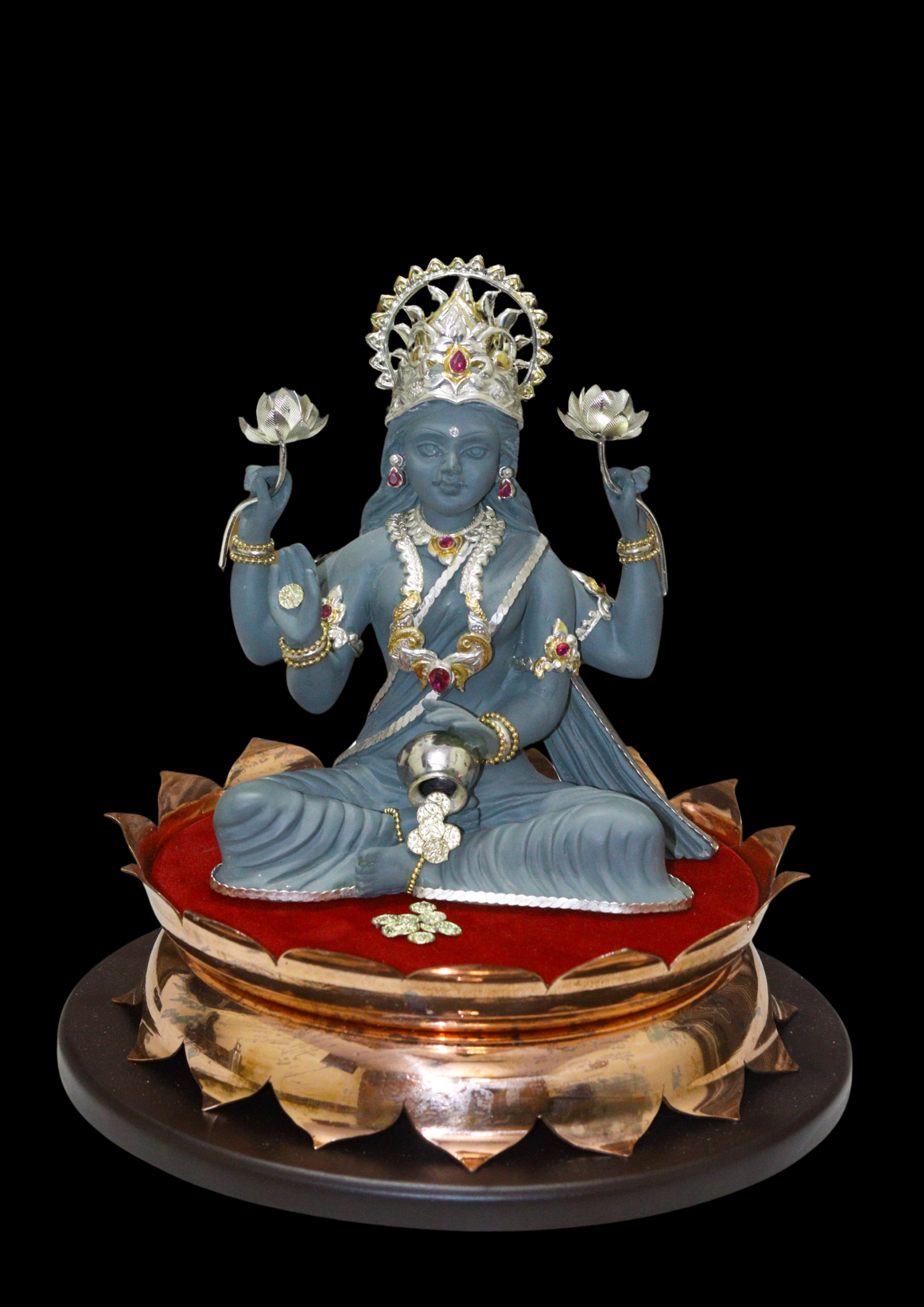 Enhance your home with divine blessings and aesthetic beauty through this exquisite Goddess Lakshmi Idol, symbolizing wealth, prosperity, and abundance. This finely crafted murti features Maa Lakshmi seated gracefully on a lotus base, holding lotus flowers and showering coins, representing financial growth and positivity.